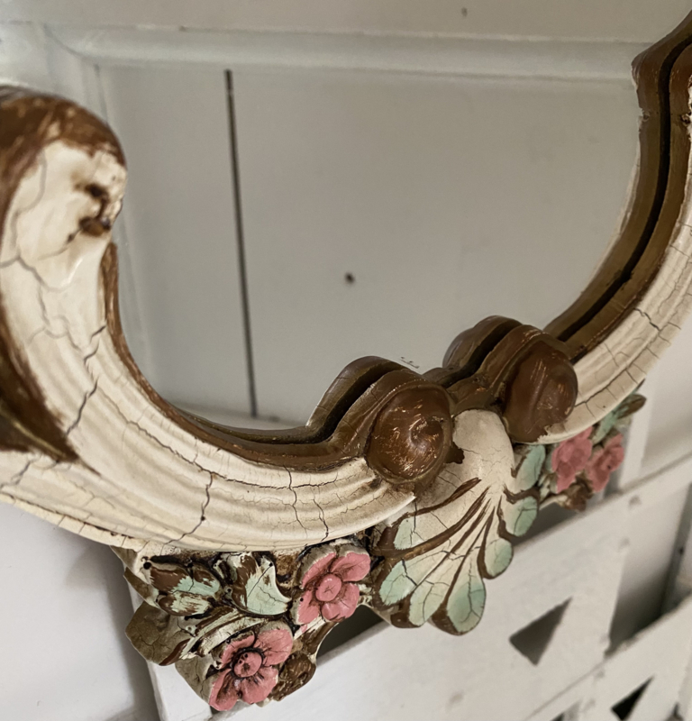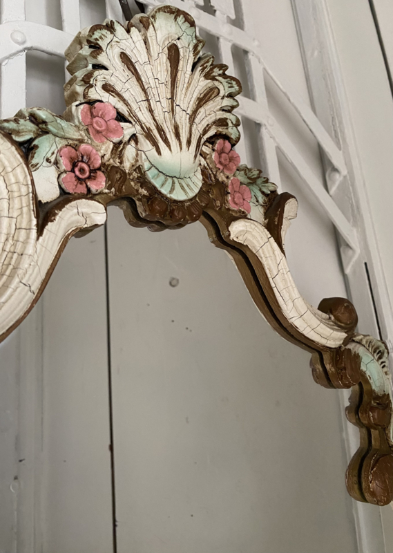 Prachtige oude houten spiegel met kuif, roomwit met pastel tinten in de bloemen