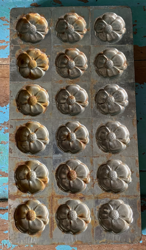 Oude chocoladevorm voor bloemen chocolaatjes, zwaar, wat roest aan de voorkant, zie foto 2