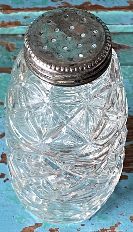 Oude strooier van bewerkt glas met metalen dopje
