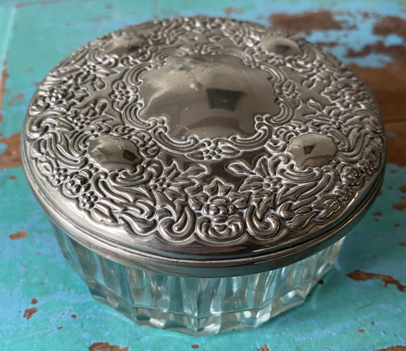 Vintage Engelse poederdoos van gefacetteerd glas, sierlijk metalen deksel met spiegel aan de binnenkant