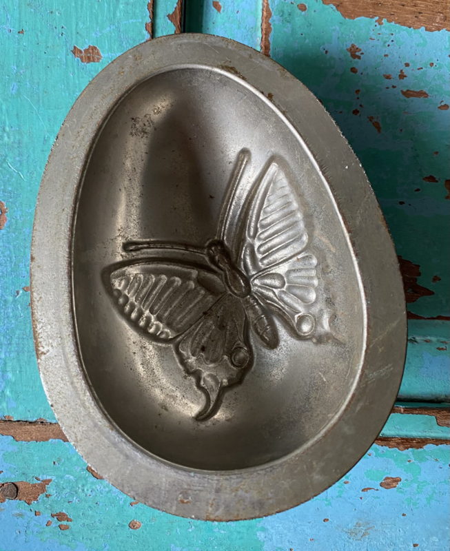 Oude halve metalen paaseivorm met vlinder, Arnold Kalmeijer Den Haag, nr 7008