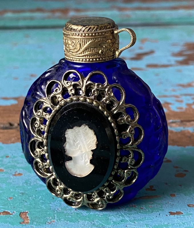 Vintage Tsjechisch parfumflesje, glas, metaal en parelmoer vrouwenhoofdje
