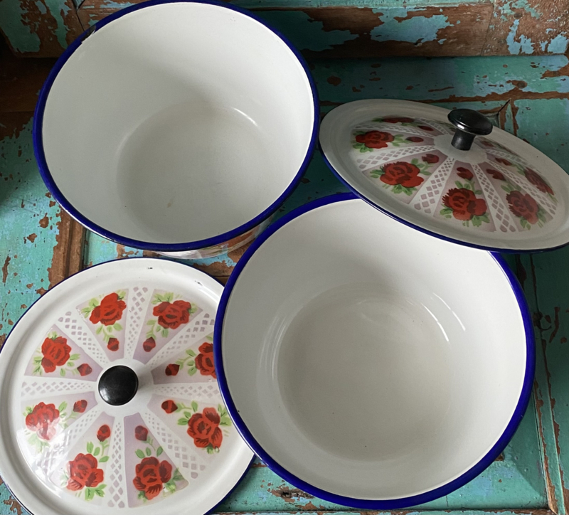 Emaille schaal met deksel en roosjes