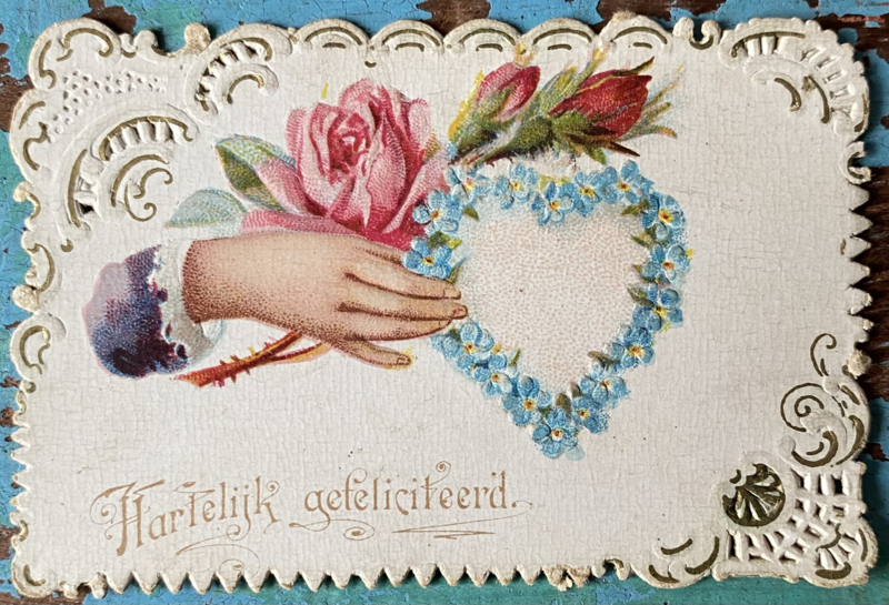 Klein antiek romantisch kaartje met mooie opengewerkte rand