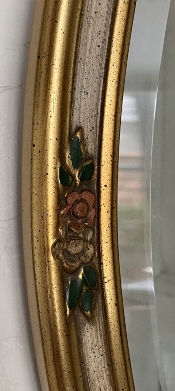 Grote oude ovale houten spiegel met bloemversiering, geslepen rand in de spiegel