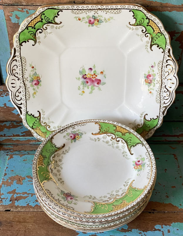 Oud Engels gebakstel "Kenmare", serveerbord met zes gebaksbordjes