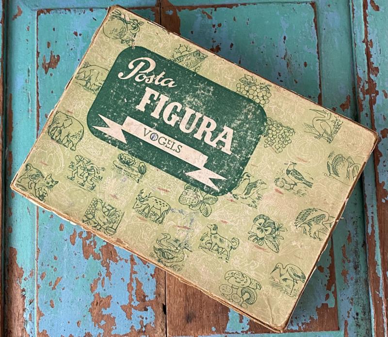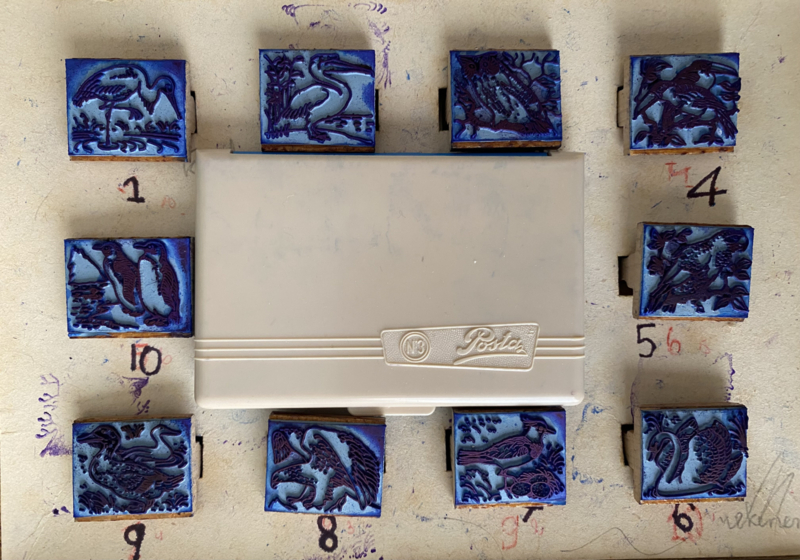 Vintage doosje schoolstempels, Posta Figura, 10 stempels met vogeltjes