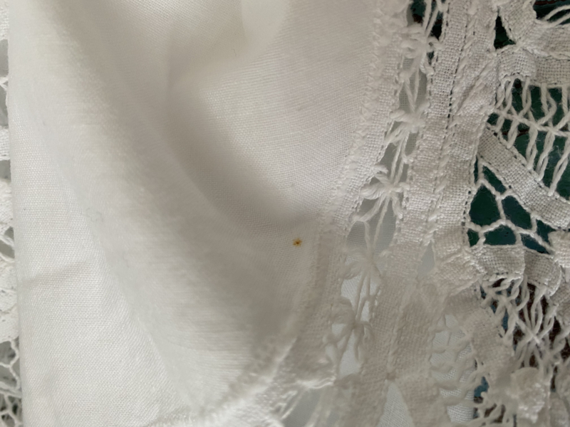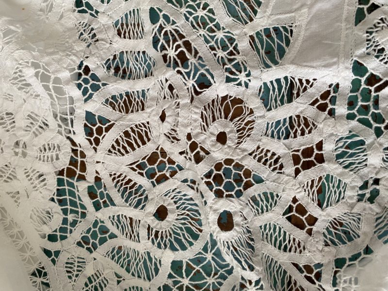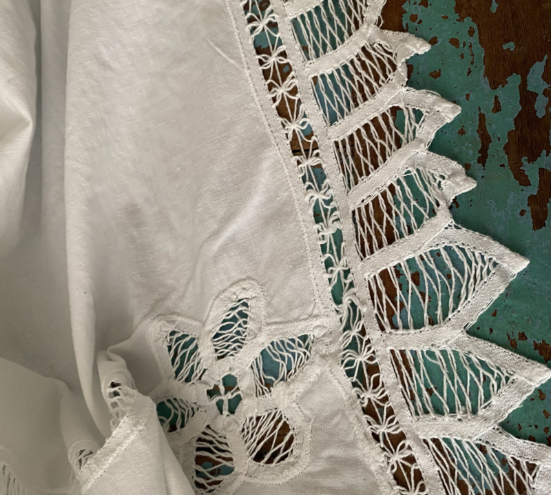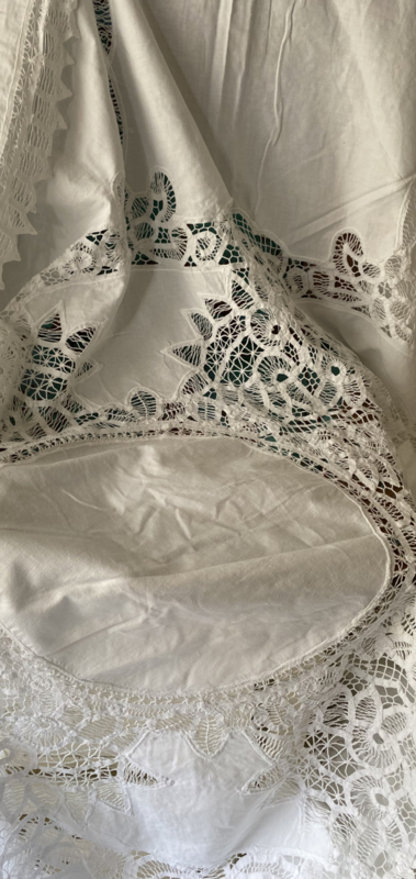 Oud wit katoenen ovaalrond kleed met "kantrand" en mooie "kantstukken"