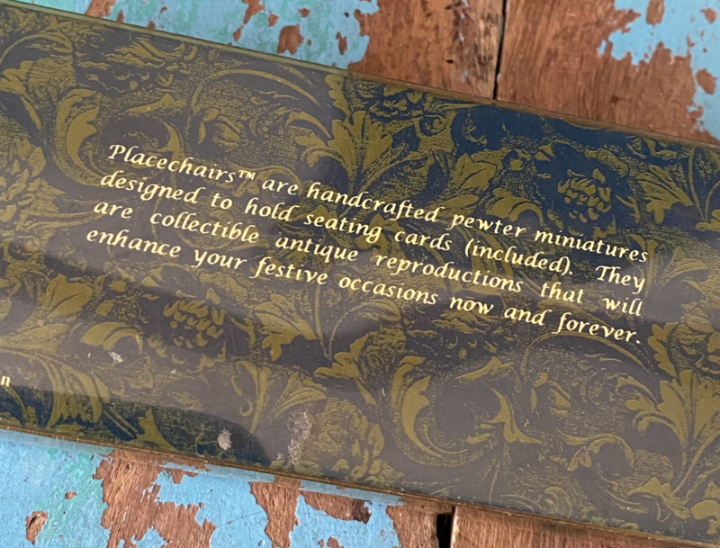 Kleine zilverkleurige metalen stoeltjes om naast het bord te zetten met een naamkaartje erin