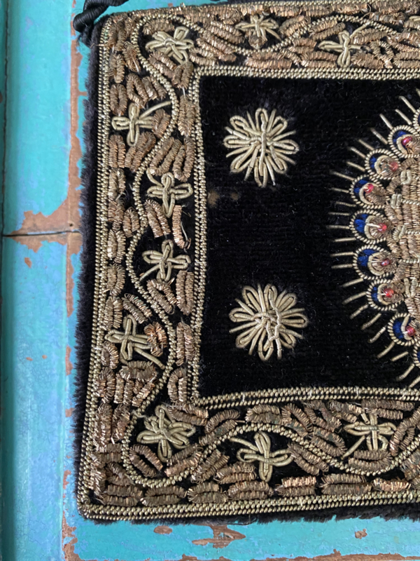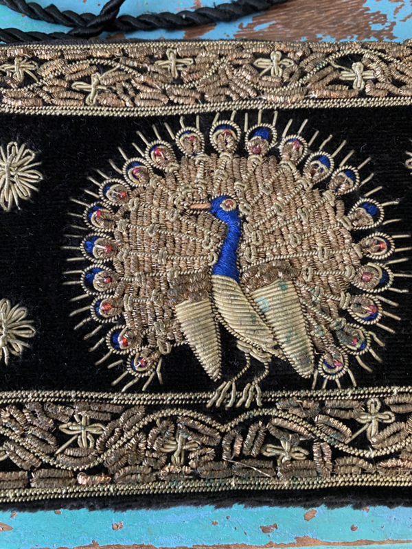 Vintage tasje met ijzergaren versiering, prachtige pauw