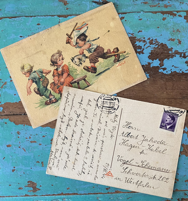 Twee oude kinderkaarten met leuke tekeningen, beschreven, eentje heeft een bijzondere postzegel...😬