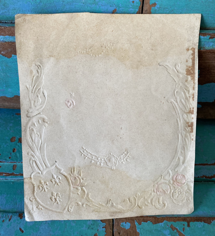 Antiek etiket, eind 1800-begin 1900, Pompadour, Madame Pompadour was de maîtresse van koning Lodewijk XV van Frankrijk, sierlijke gouden omlijsting met Franse lelies en rozen, het motief is erin gedrukt