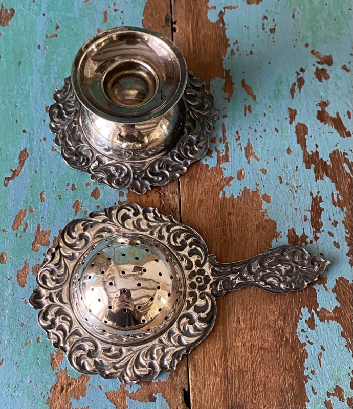 Vintage zeefje met lekbakje, mooi versierd, gebruikerssporen