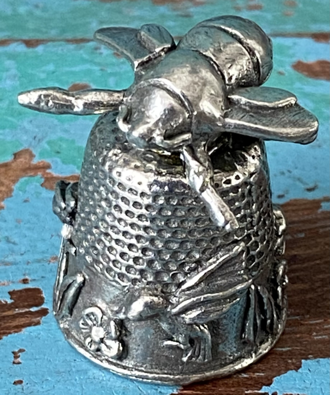 Zware zilverkleurige metalen vingerhoed met bloemetjes, vogeltjes en een grote bij bovenop