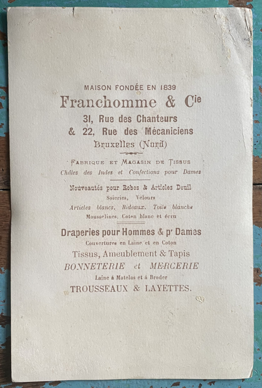 Antieke reclamekaart Maison Franchomme&cie Bruxelles, stoffenwinkel en fabrikant opgericht in 1839