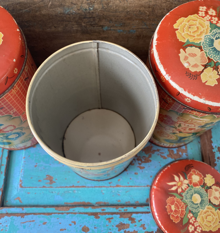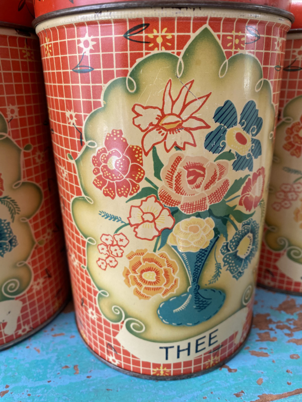 Daar word je toch vrolijk van? Fleurig oud voorraadblikken set, thee, suiker en koffie