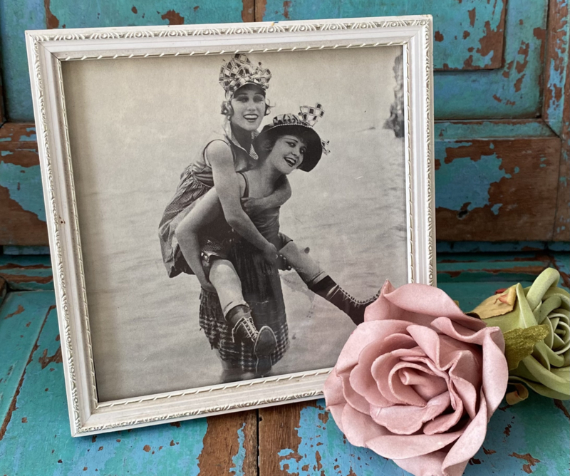 Uit Engeland, vierkant houten vintage lijstje om neer te zetten, wit met goud