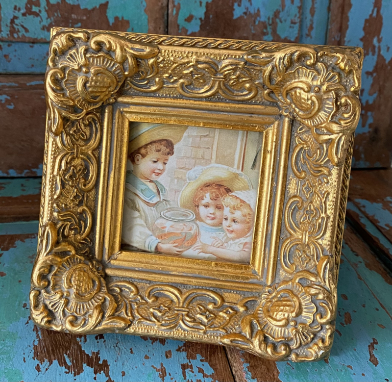 FlorenceHouten handgemaakt lijstje met bladgoud, Florence, vintage, met afbeelding achter glas