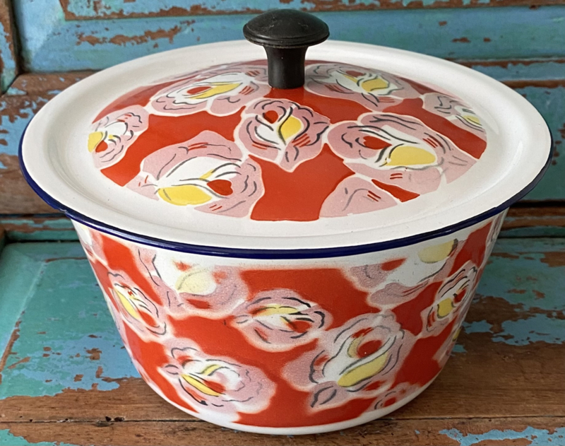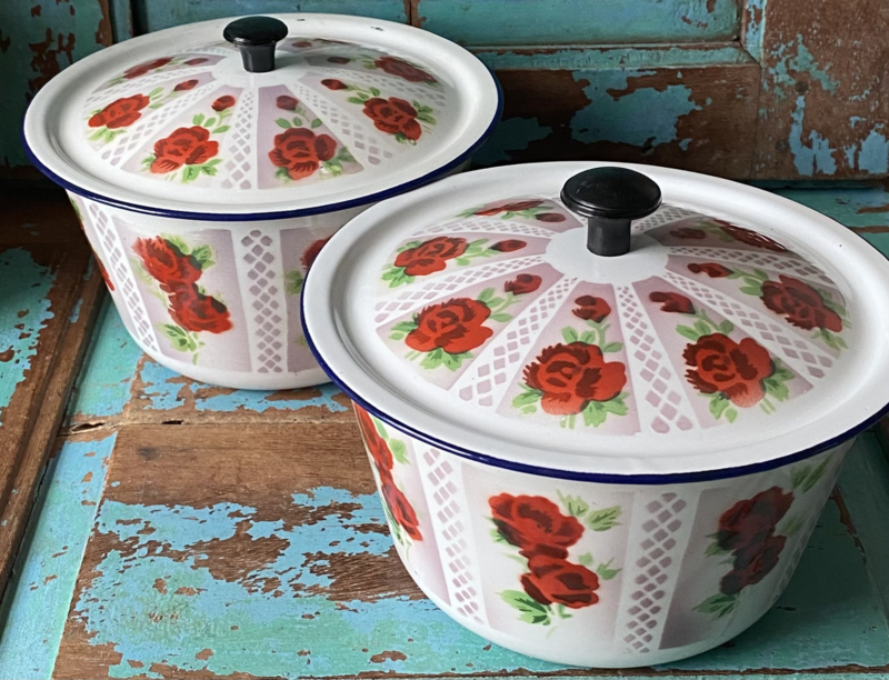 KroezenDrie oude emaille kroezen in verschillende groottes