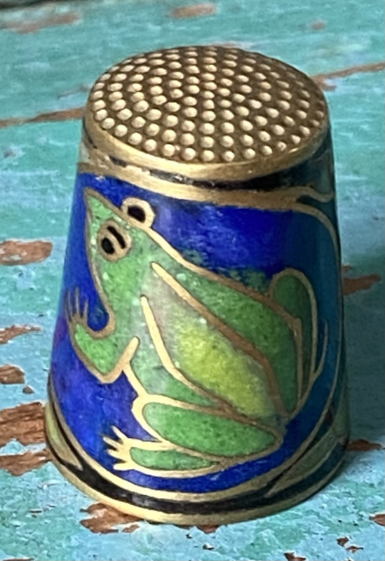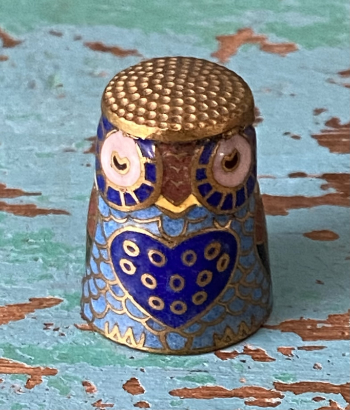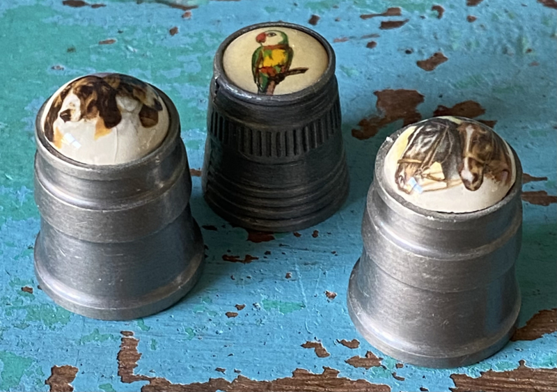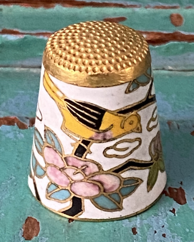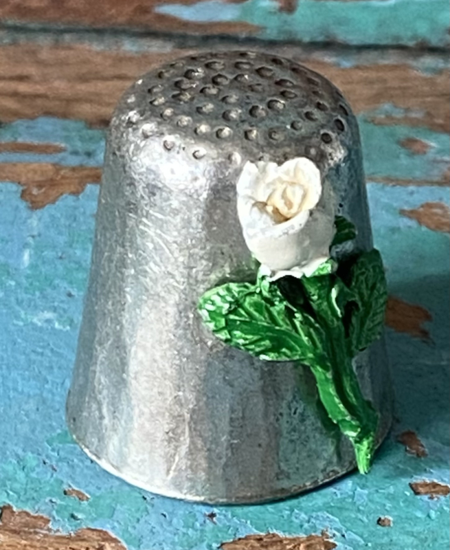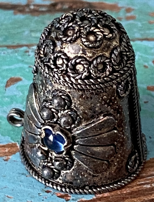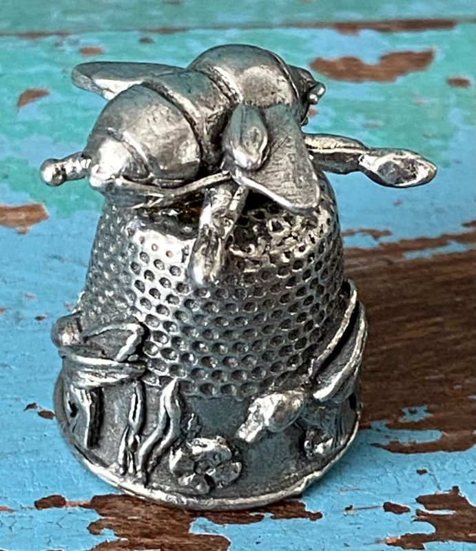 Bijzondere vingerhoedZware zilverkleurige metalen vingerhoed met bloemetjes, vogeltjes en een grote bij bovenop