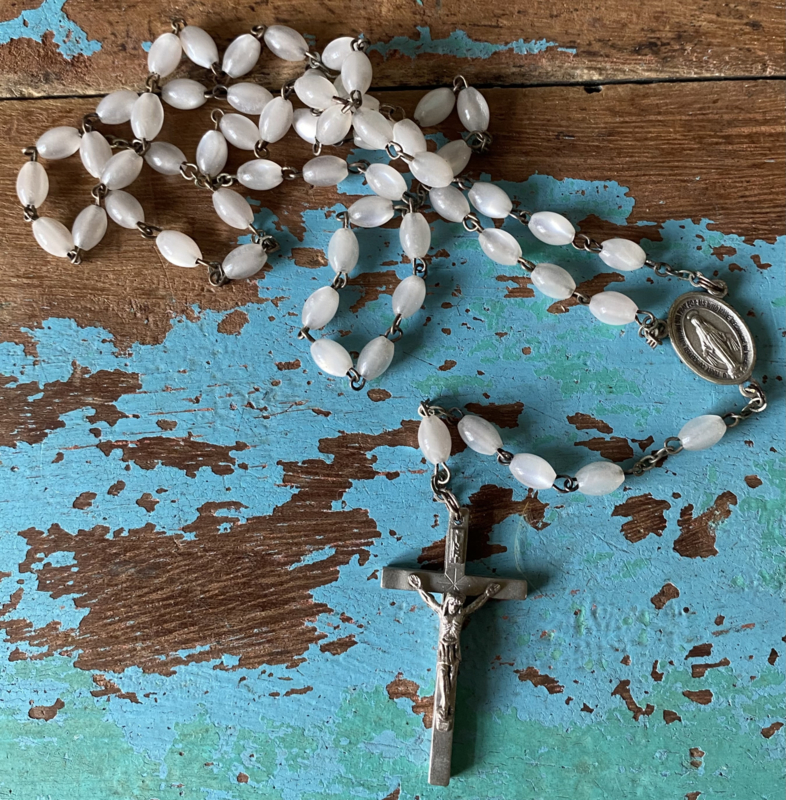 ParelmoerOude rozenkrans, zware parelmoer kraaltjes, parelmoer kruisje en metalen medaillonnetje