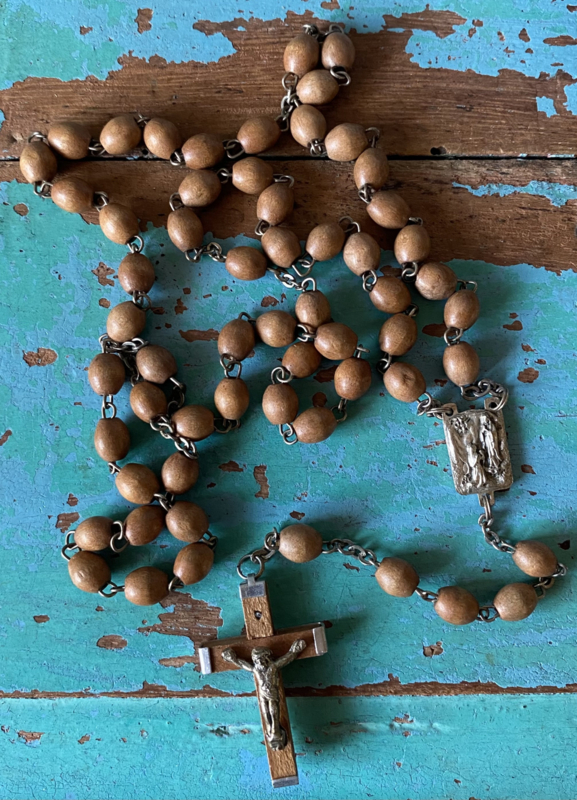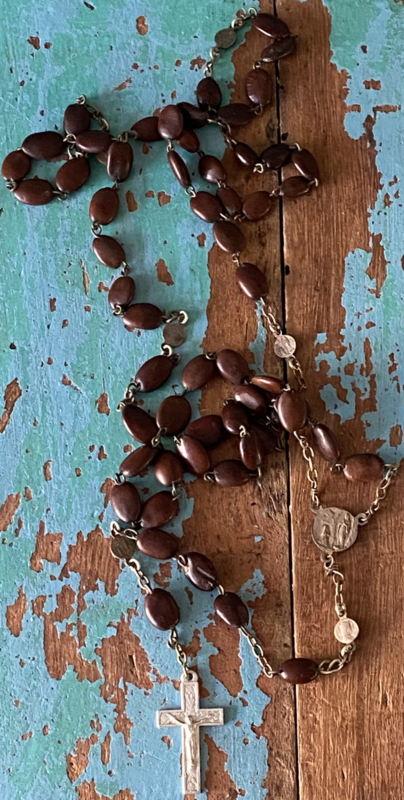 Kleine bruine kraaltjesOude rozenkrans met kleine bruine kraaltjes, kruisje van zilvermetaal en hout en medaillon