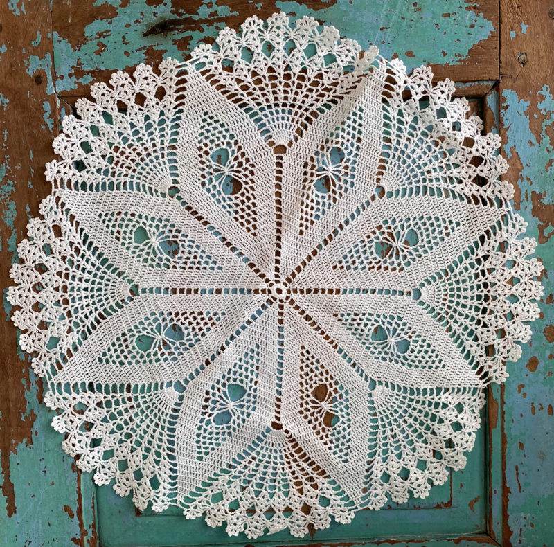 Gehaakt vintage kleedje met een soort blaadjes patroon Ø40cm