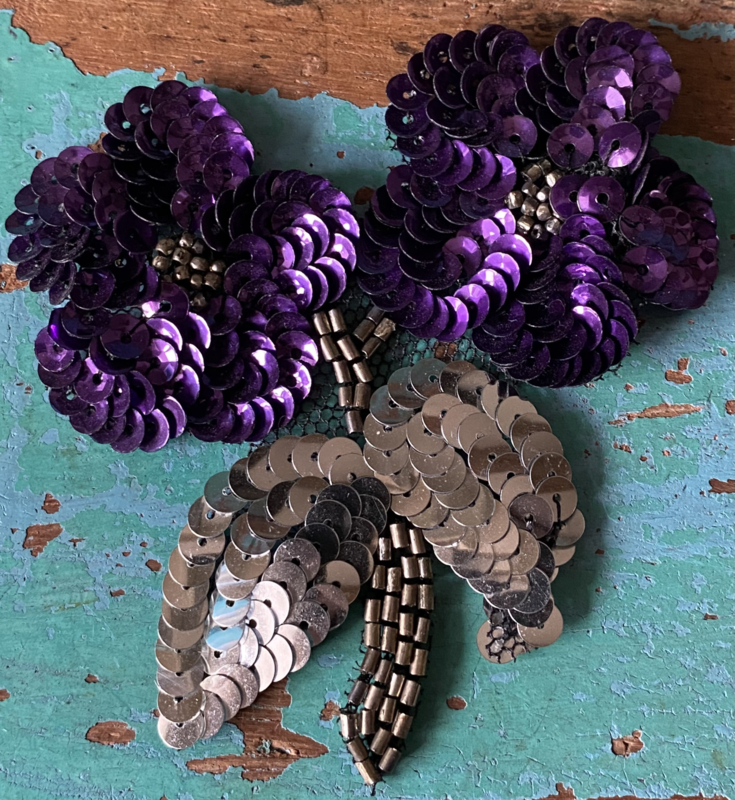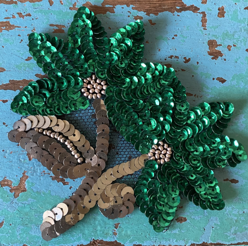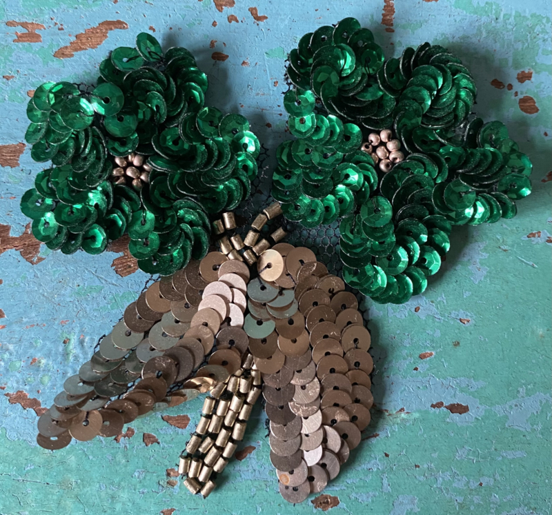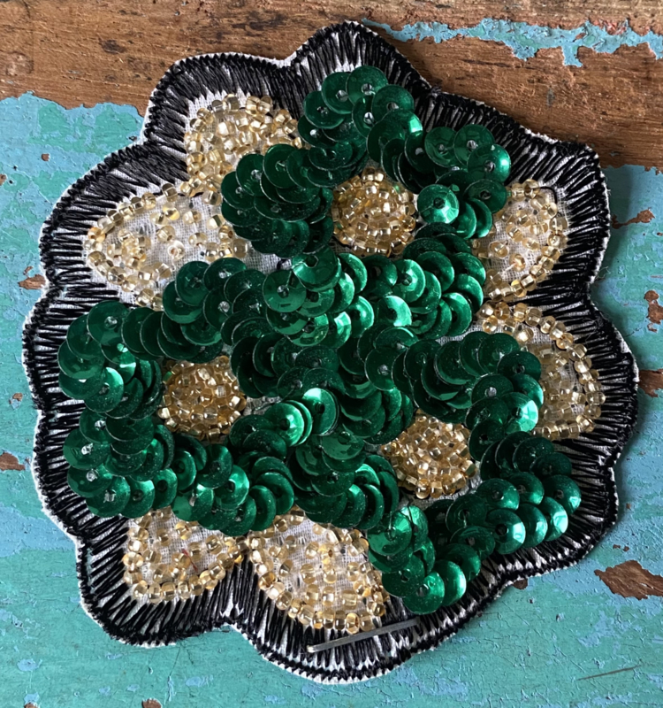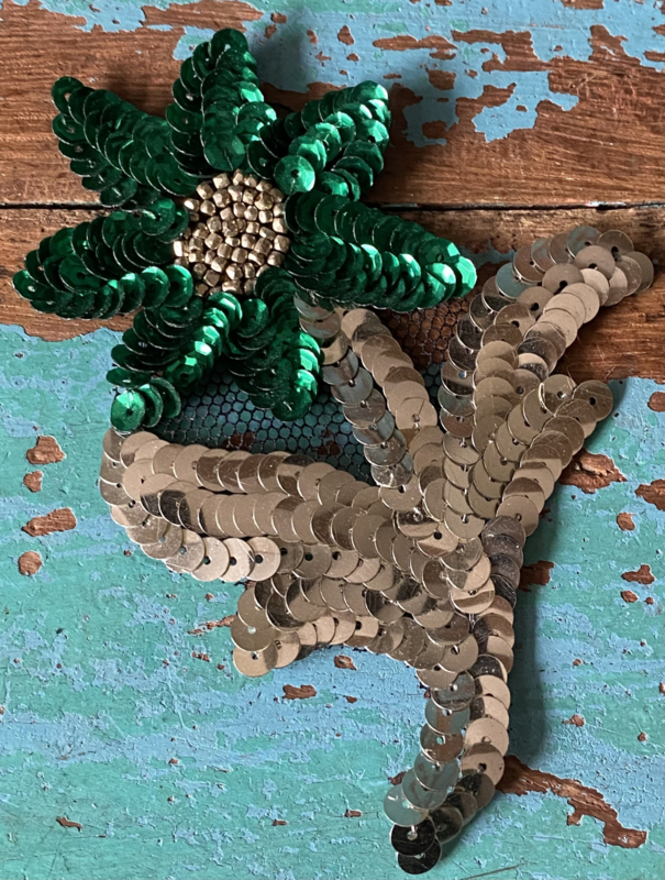 BloemenapplicatieTwee bloempjes, applicatie met groene en zilveren pailletten en kraaltjes