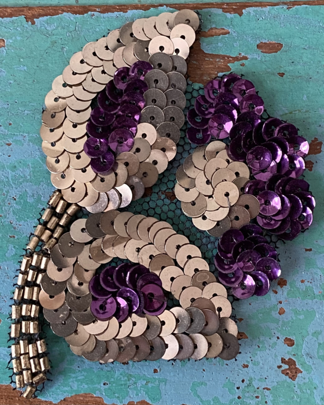 Kralen en pailletten (115cm)Lange rand, afkomstig van vintage jurk met kralen en pailetten, op een plek zijn kralen los/af, links onder op de foto
