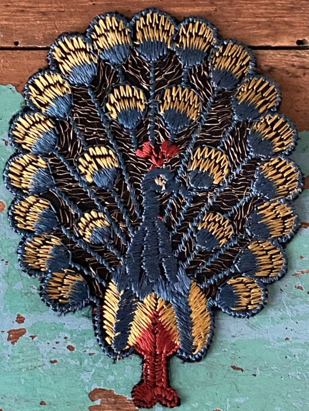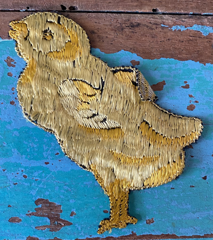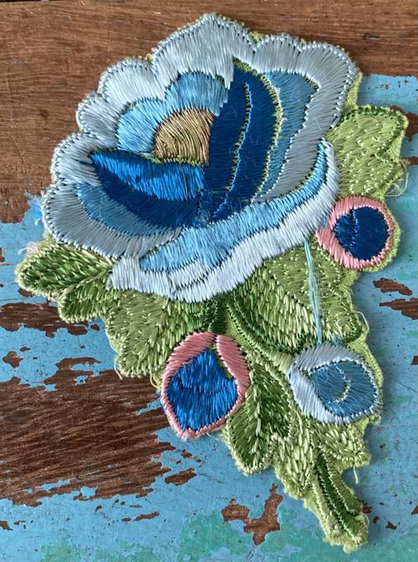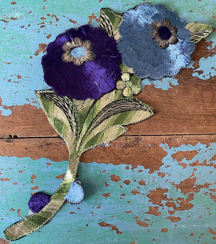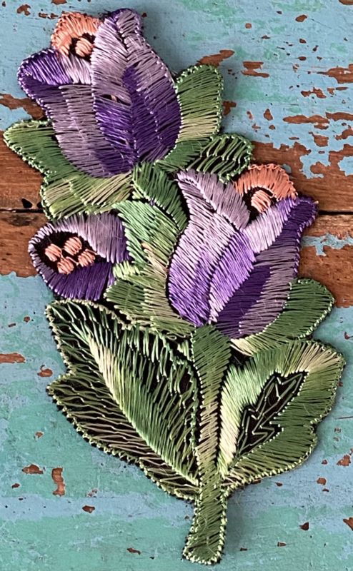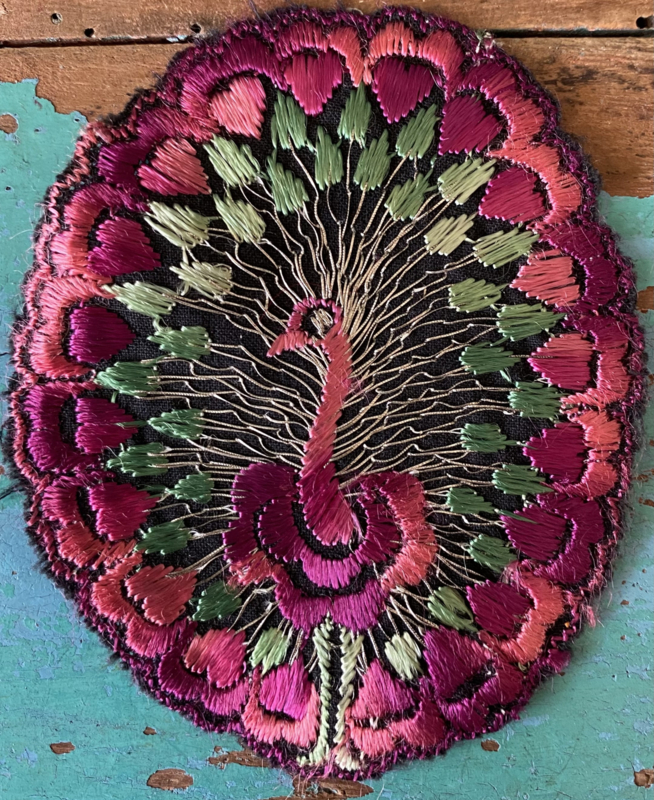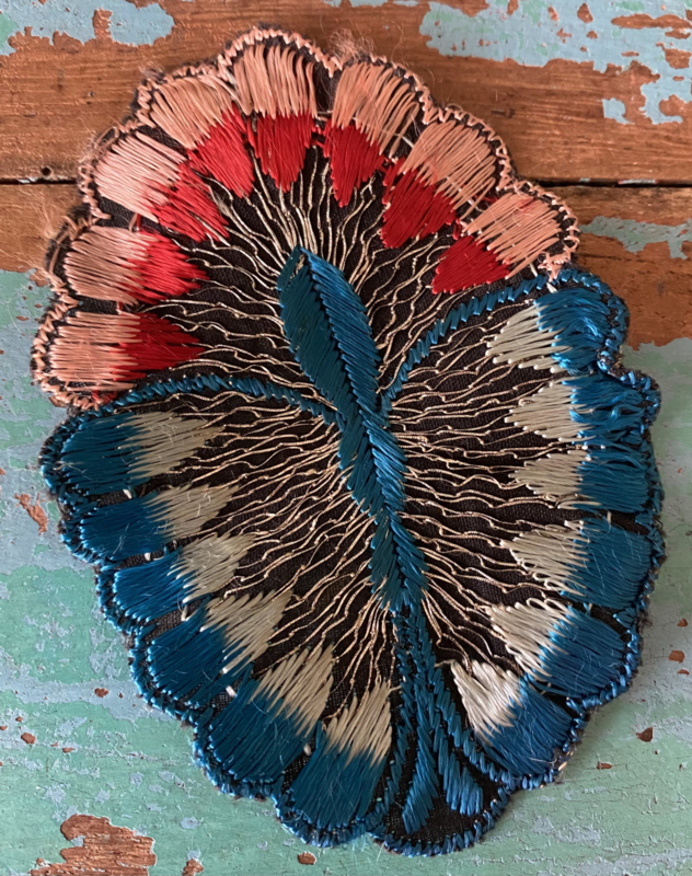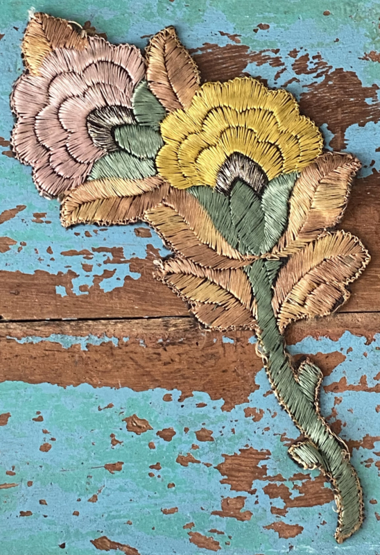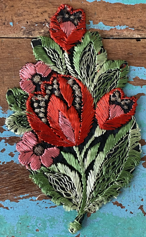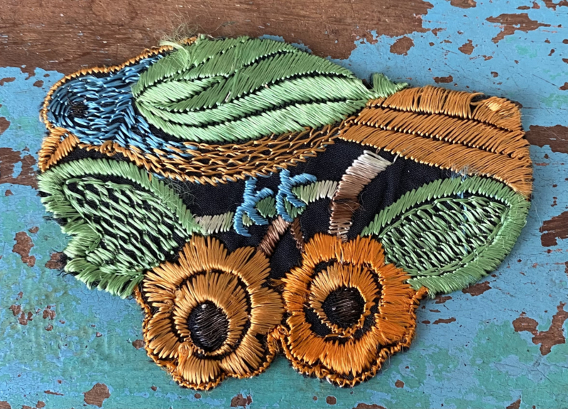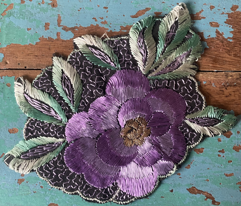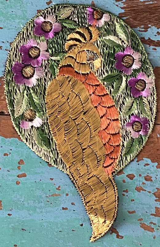 Grote Turmac textielapplicatieGrote jaren 30 zijden applicatie, Turmac "Zijdje", vogel tussen bloemen