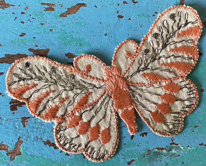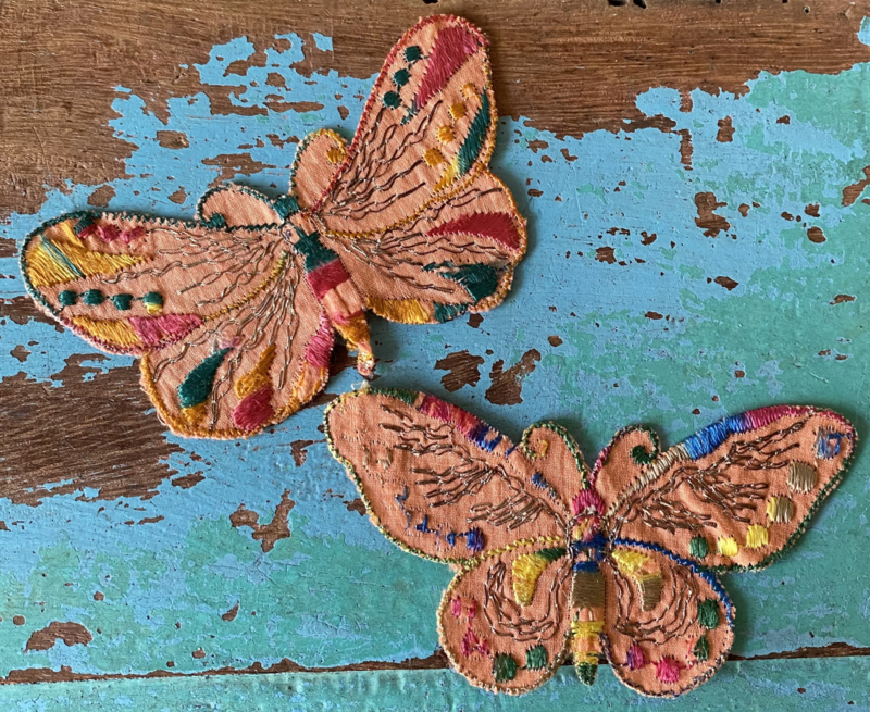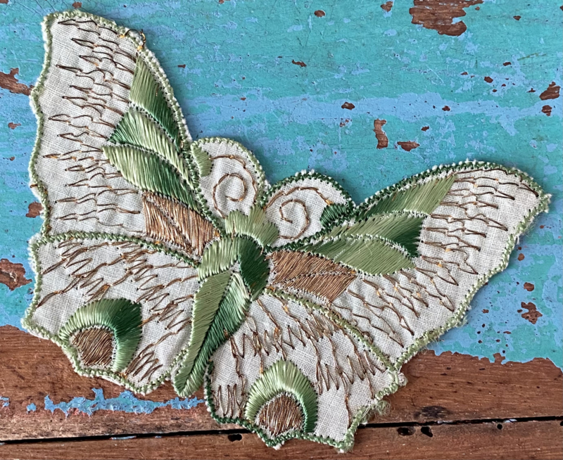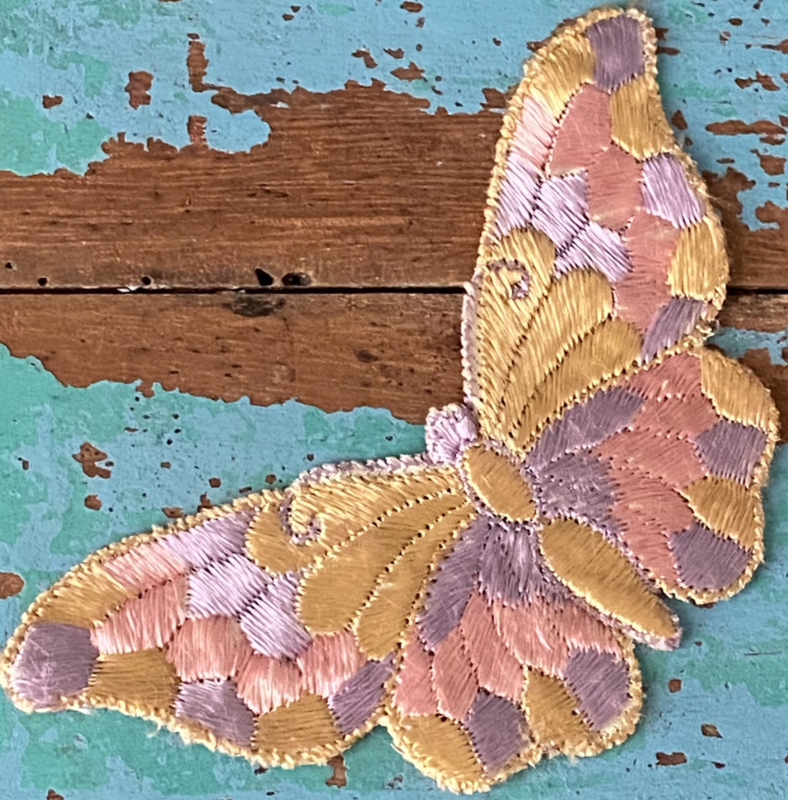 Vlinder textielapplicatieJaren 30 zijden textielapplicatie, Turmac "Zijdje", vlinder in zachte tinten