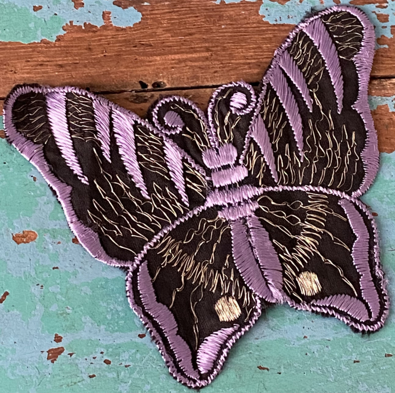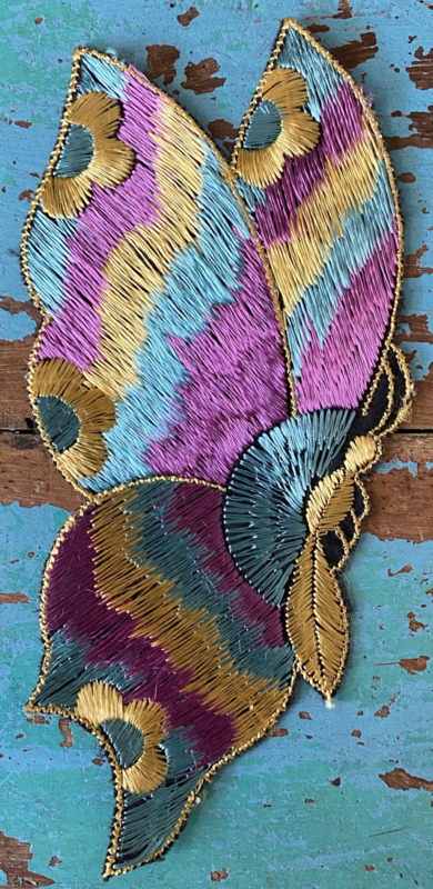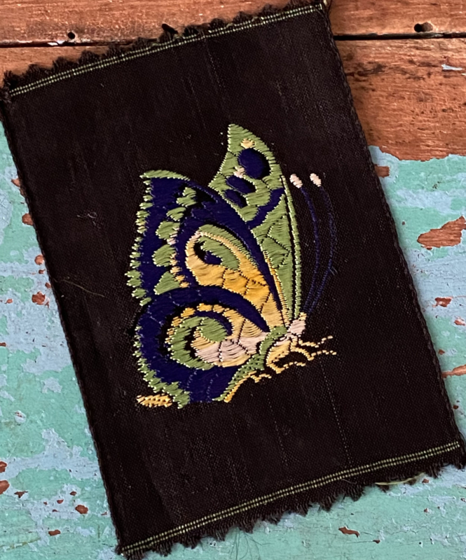 Jaren 30 zijden applicatieJaren 30 zijden geweven textielapplicatie, Kensitas, vlinder in prachtige tinten