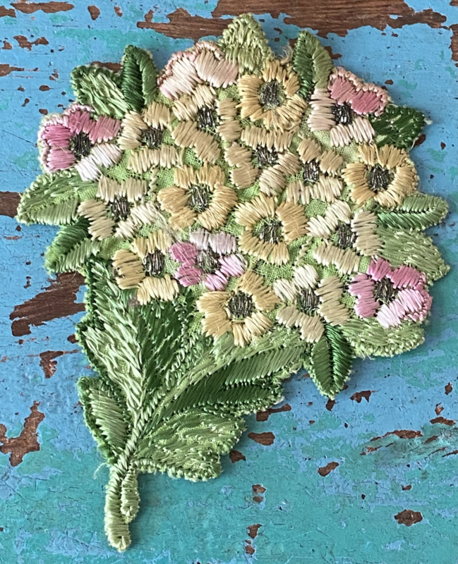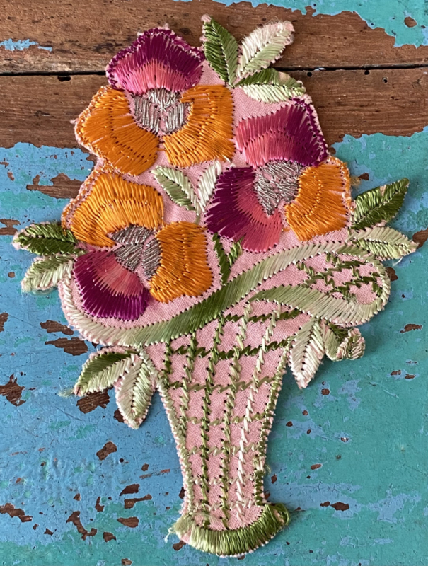 Vaasje bloemenTurmac "Zijdje", jaren 30 textielapplicatie, vaasje bloemen in pasteltinten, hoog: 9cm