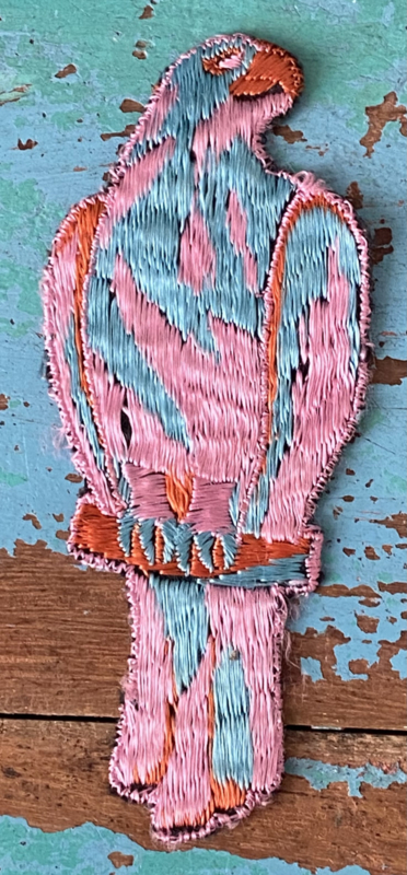 Vogel applicatie jaren 30Jaren 30 Turmac "Zijdje", tropische vogel op tak in mooie tinten